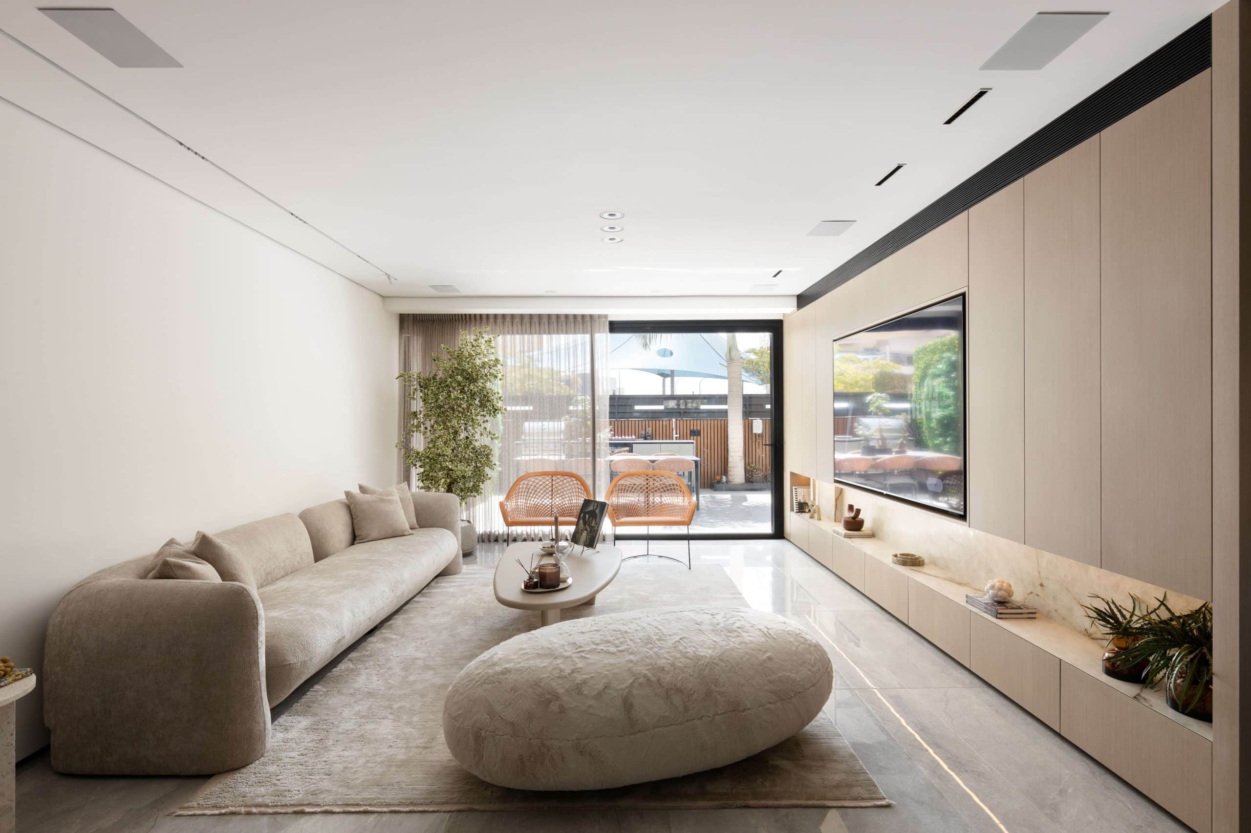 הריהוט מספק תחושת חמימות עם שימוש בבדים בגוונים טבעיים ורכים, המשלבים בין פונקציונליות לעיצוב. שולחנות הקפה המעוצבים בקווים מינימליסטיים ושטיחים במרקמים עדינים מוסיפים שכבת עומק לחלל.